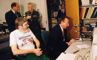 Gov Tommy Thompson (right) speaking to WB9RQR on 40 meters from the Wisconsin Emergency Management emergency operations center radio room. Next to the governor is control operator Sam Rowe, KN9NG. In the background are (left) Wisconsin Emergency Management Administrator Ed Gleason chats with Wisconsin Adjutant General Maj Gen James Blaney. [Photo by Larry Sommers/Wisconsin Dept of Military Affairs] |