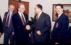 FCC Commissioner Michael Powell (center) shakes hands with ARRL President Jim Haynie, W5JBP after meeting at Commission offices in Washington to discuss Amateur Radio issues. Looking on are ARRL First Vice President Joel Harrison, W5ZN (right) and Executive Vice President Dave Sumner, K1ZZ (left).