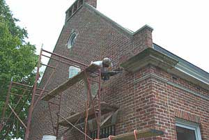 A workman removes deteriorated grout in the brickwork on the W1AW building's north side.