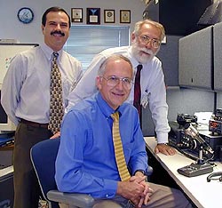 National Hurricane Center Director Max Mayfield, sits at the W4EHW station. Standing are NHC Amateur Radio Coordinator John McHugh, KU4GY (right), and Assistant Coordinator Julio Ripoll, WD4JR (left).