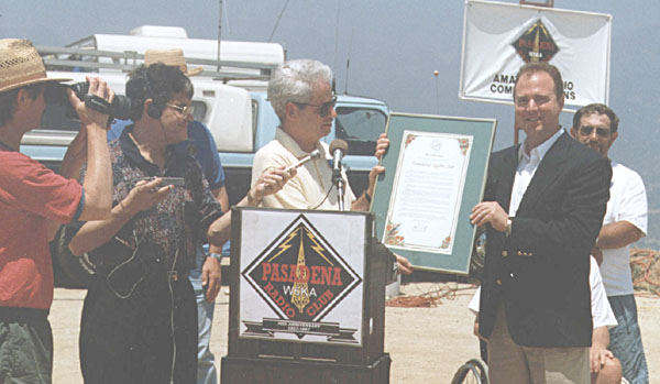 California State Sen Adam Shiff of Burbank (right) presents a resolution from the California Legislature to Pasadena Radio Club President John Minger, AC6VV, recognizing the club's 40 years of public service activities. - US House honors Pasadena Radio Club: The Pasadena Radio Club, W6KA, took advantage of this year's Field Day (June 28-29) to commemorate its 40th year of affiliation with the ARRL. Proclamations from both the US House of Representatives and the California Legislature honored the group's 40 years of public service. The club was founded in 1957 and has been called upon numerous times over the years to help out in emergencies. Club members relayed health and welfare traffic during the days following the 1994 Northridge earthquake. The club also has supported public service activities and events. --Brett R. Henry/Pasadena Radio Club