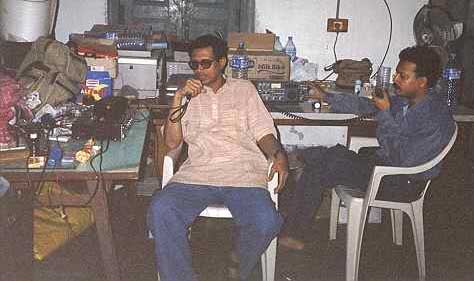 The Amateur Radio control center in the Jajpur District of Orissa: (l-r) VU2NKI operates on 2 meters while VU3BIS works the HF link. [photo courtesy of Indranil Majumdar, VU2KFR]