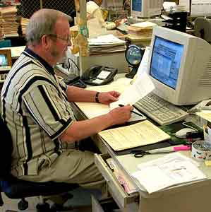 ARRL-VEC's Pete Warner checks applications from the restructuring upgrade rush. [Rick Lindquist, N1RL] |